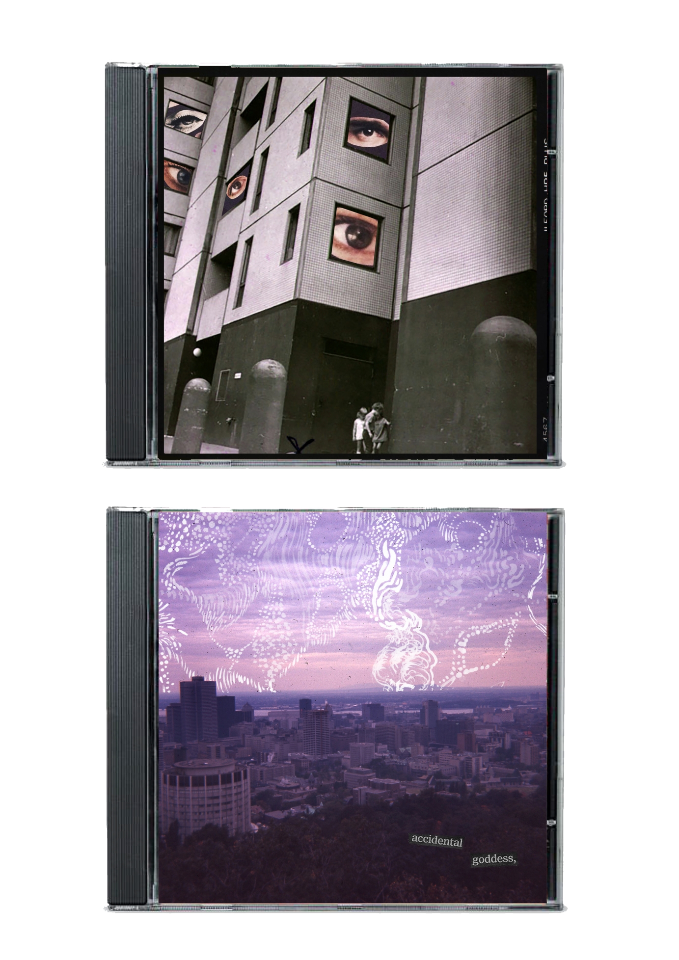 Mockup cd covers for a friends band long ago. Never ended up being used as the project was abandoned, but I loved the style. The top one is made from a medium format negative I found at a flea market, scanned, and collaged with other magazine cutouts. The bottom is 1960s slide film I bought at a garage sale, scanned and layered with painting of mine.