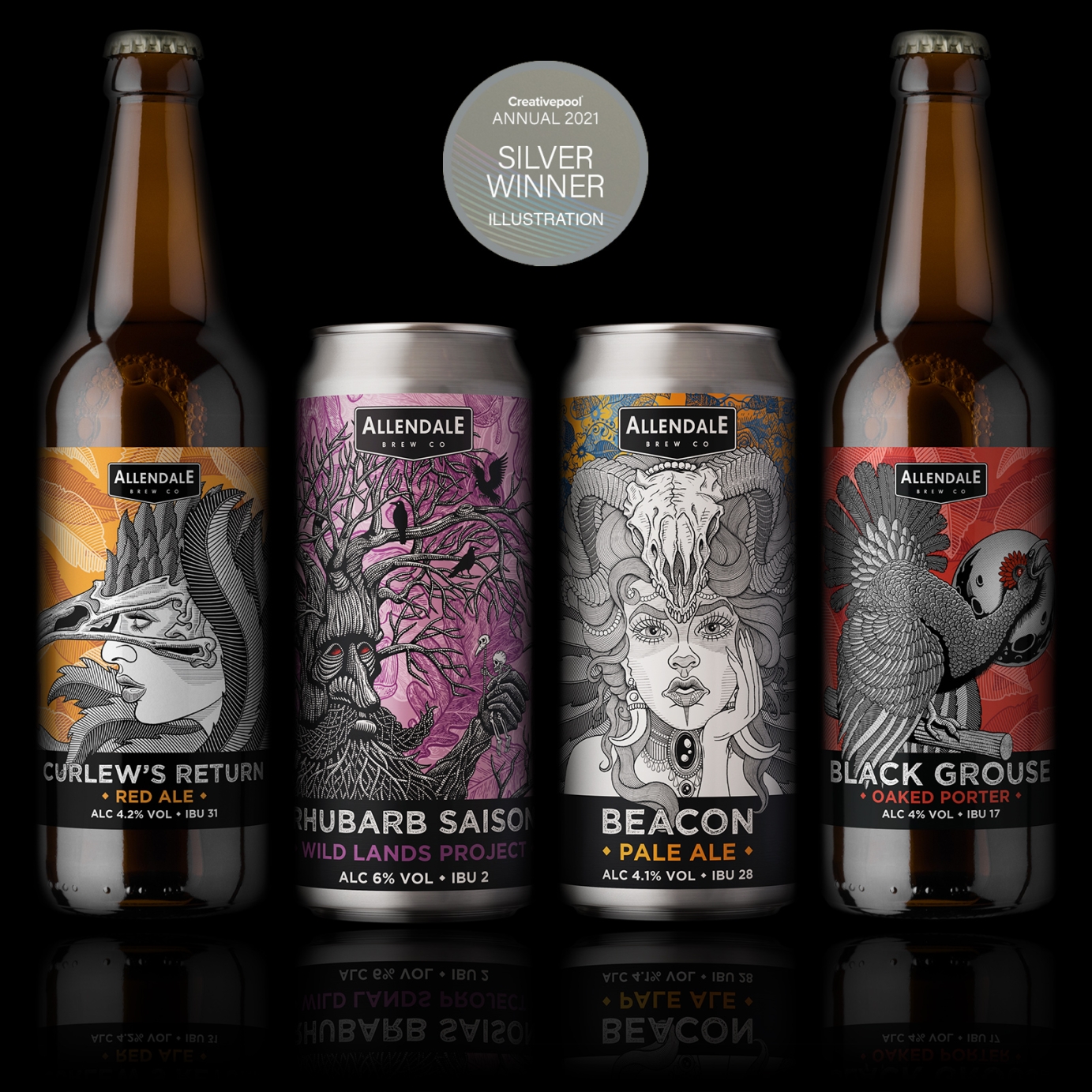 The four illustrations were commissioned by Allendale brewery. They gave me a lot of creative freedom regarding the illustrations, asking only to keep the theme similar to their existing packaging, which mostly featured monochrome Victorian-style collages against a colourful background. The commission also included a complete redesign of the pump clip shapes and bottle and can label layouts.