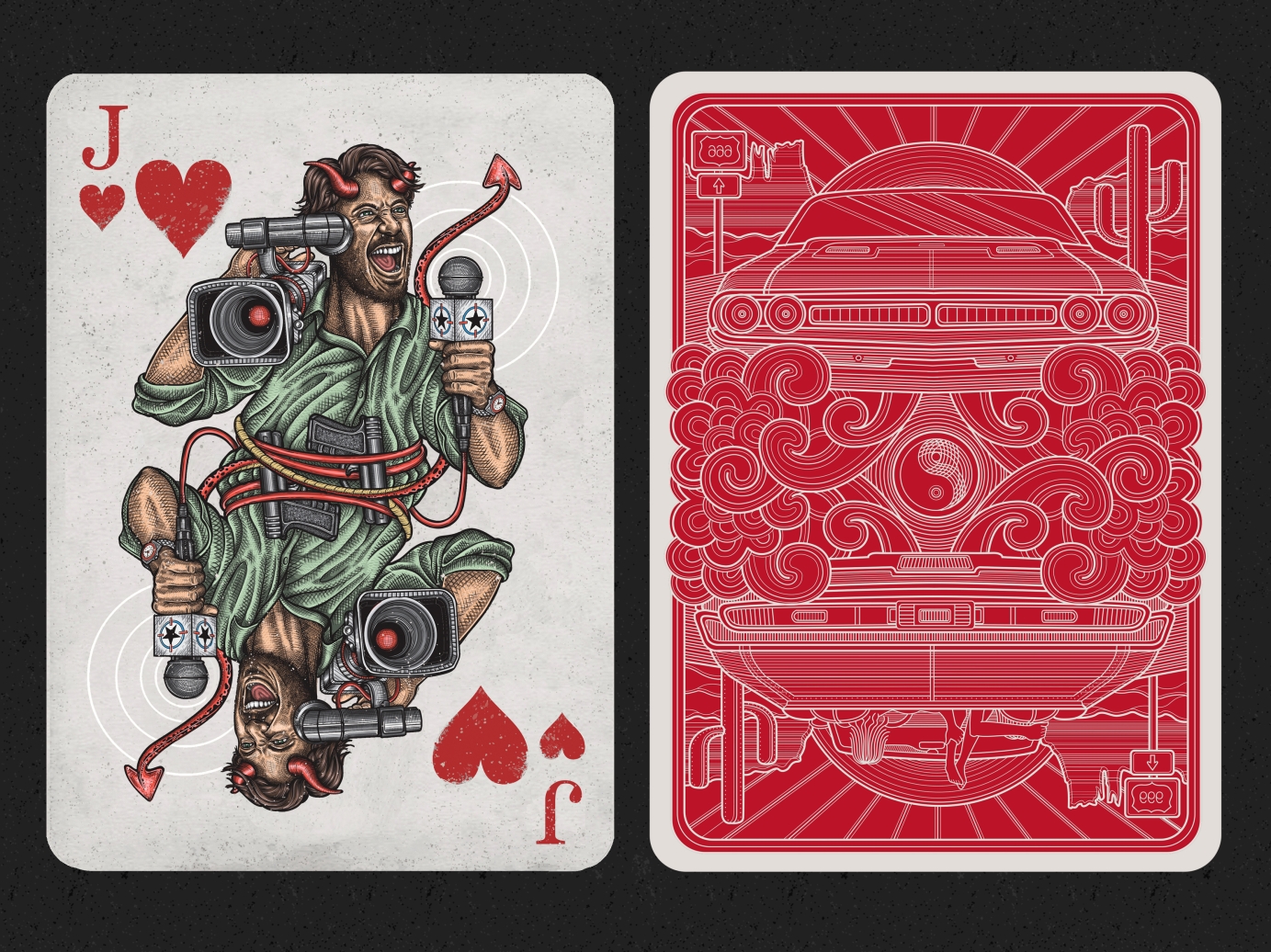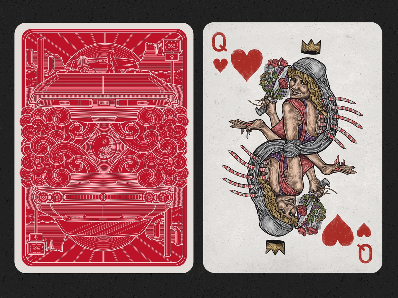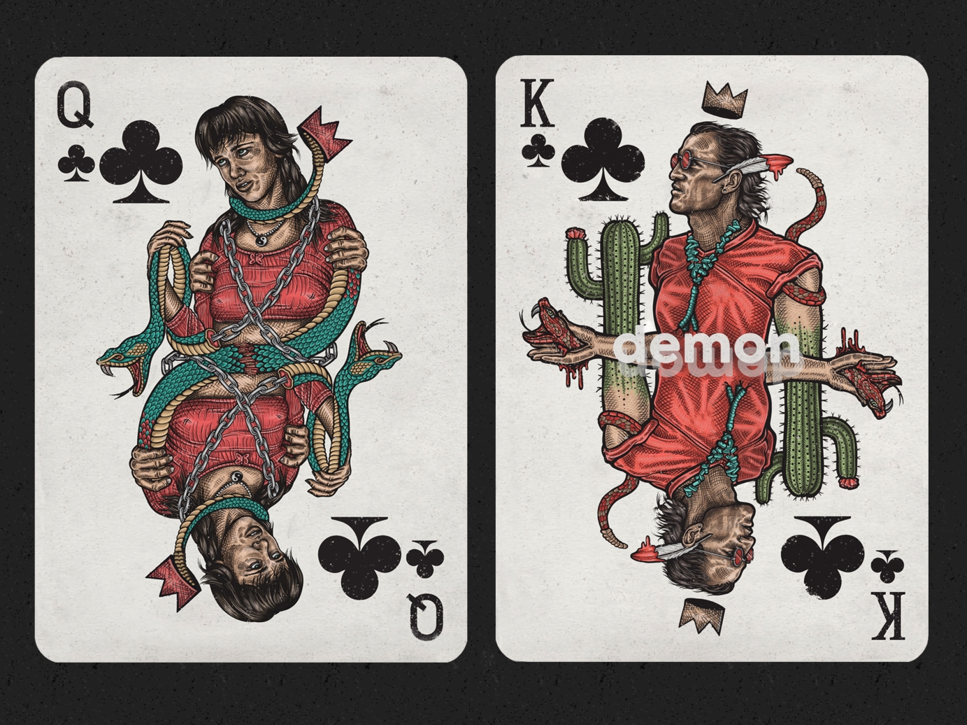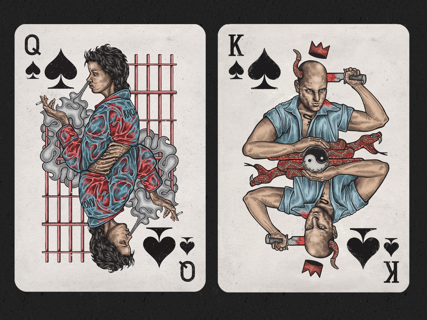 Inspired by this 90's movie, i chose to illustrate the characters as playing card figures, since they fit so well into the roles, and the movie offers so much visual information and specific imagery to play with. As the movie's one of my favourites, and i've always wanted to illustrate playing cards, it all made sense.