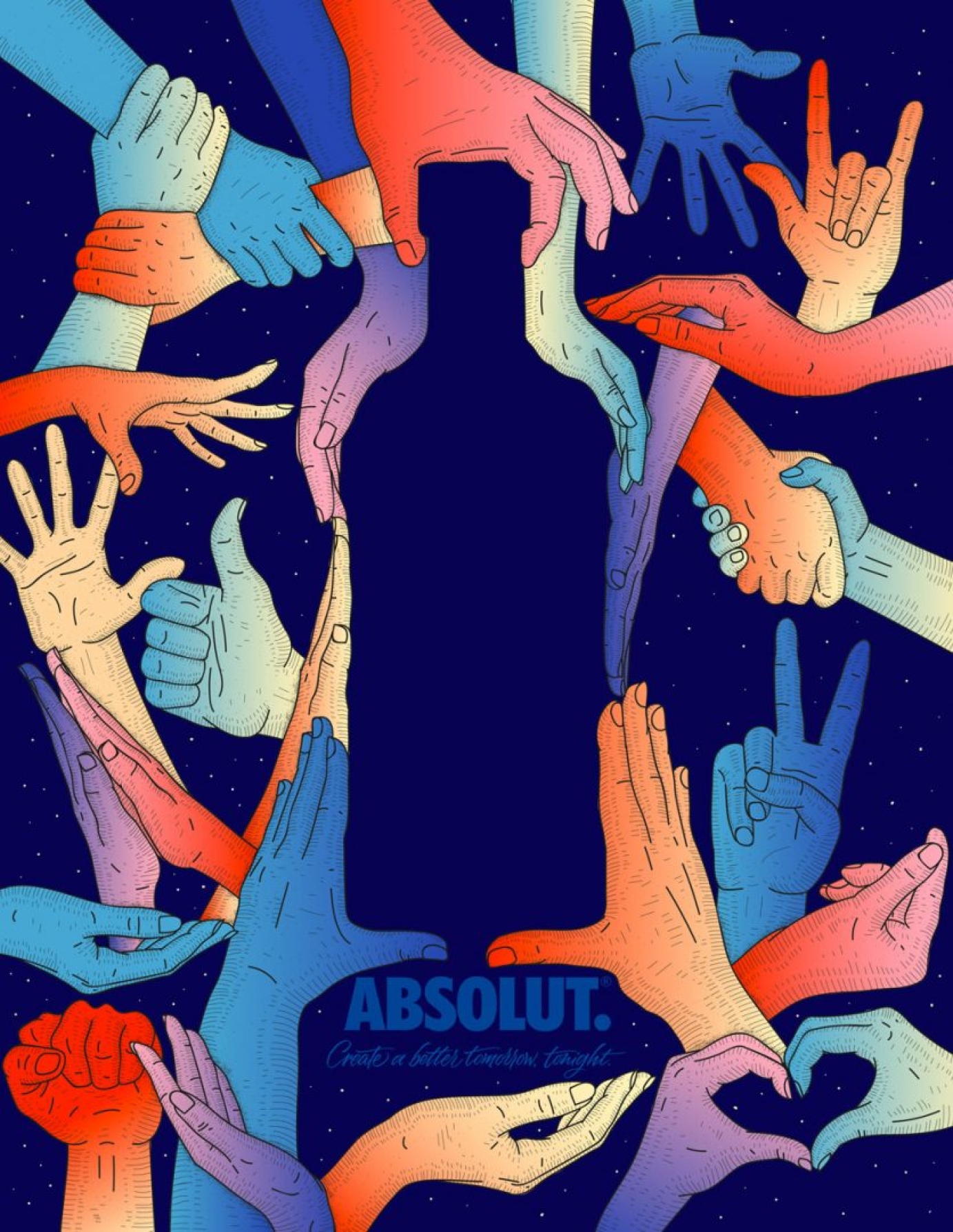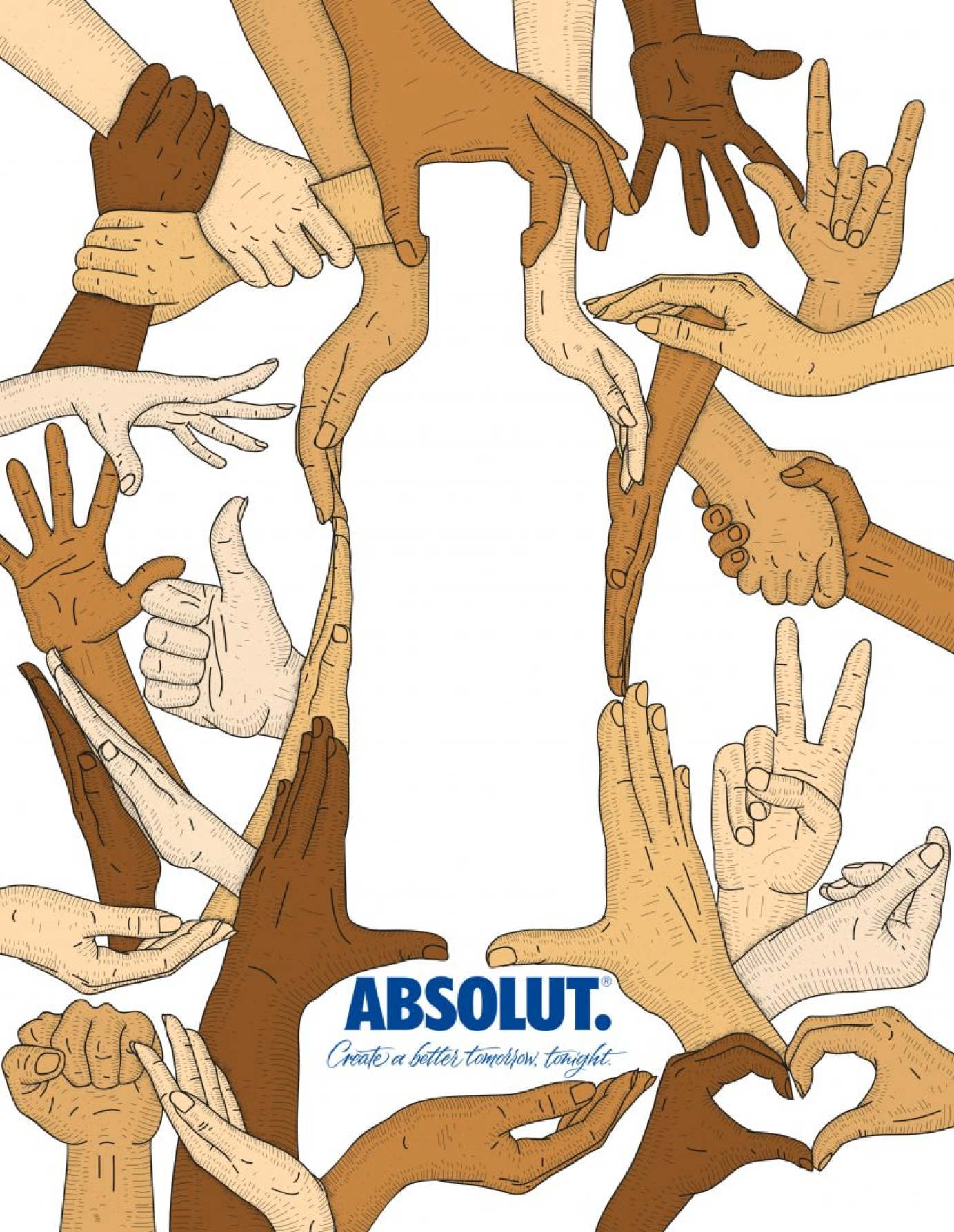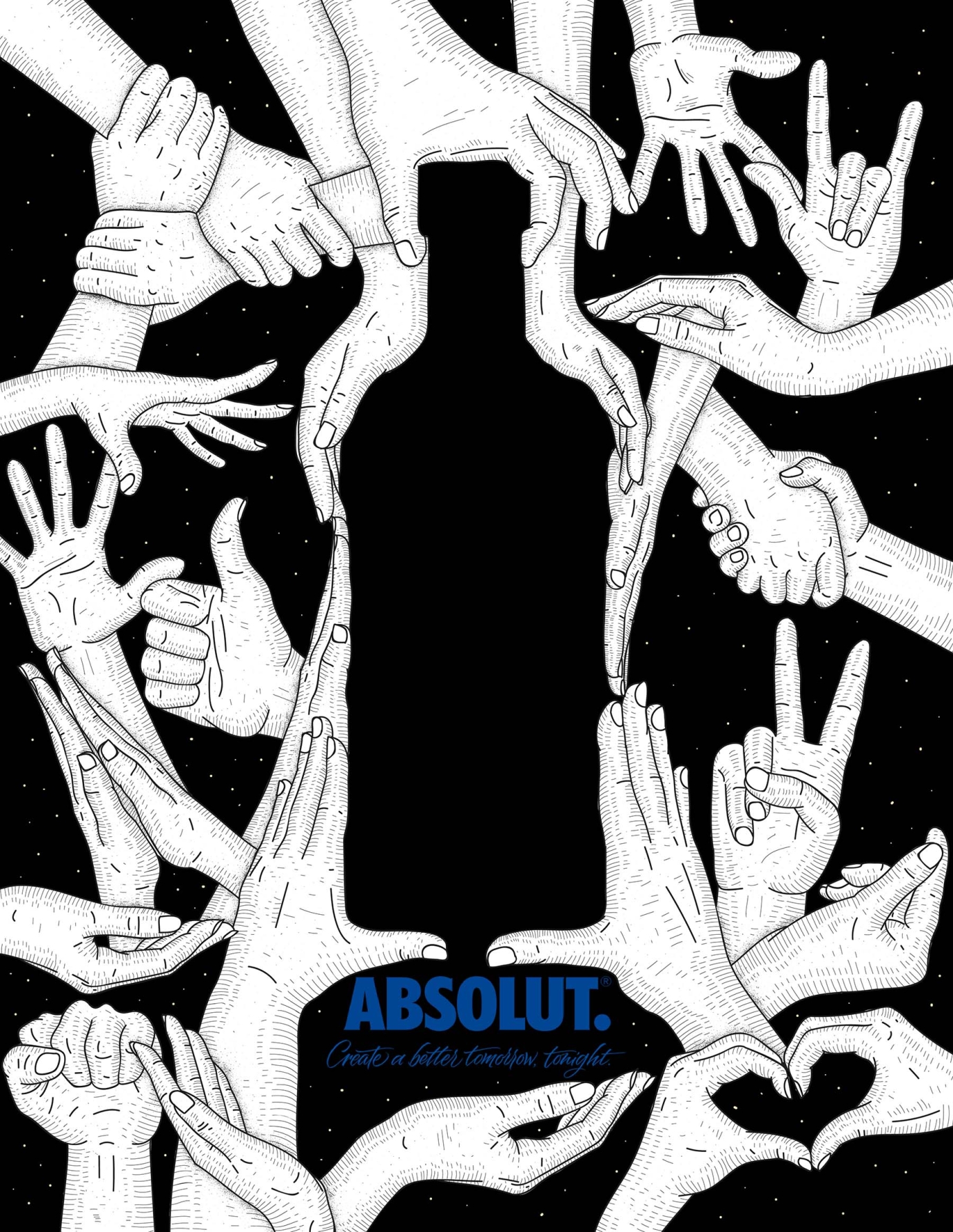 A set of hands appears in the background, interacting, creating shapes and drawing the iconic Absolut silhouette. Hands become a symbol of expression, bearers of a universal language that goes beyond the distinctions of sex and ethnicity, showing themselves as the herald of a place where all genres are equal.