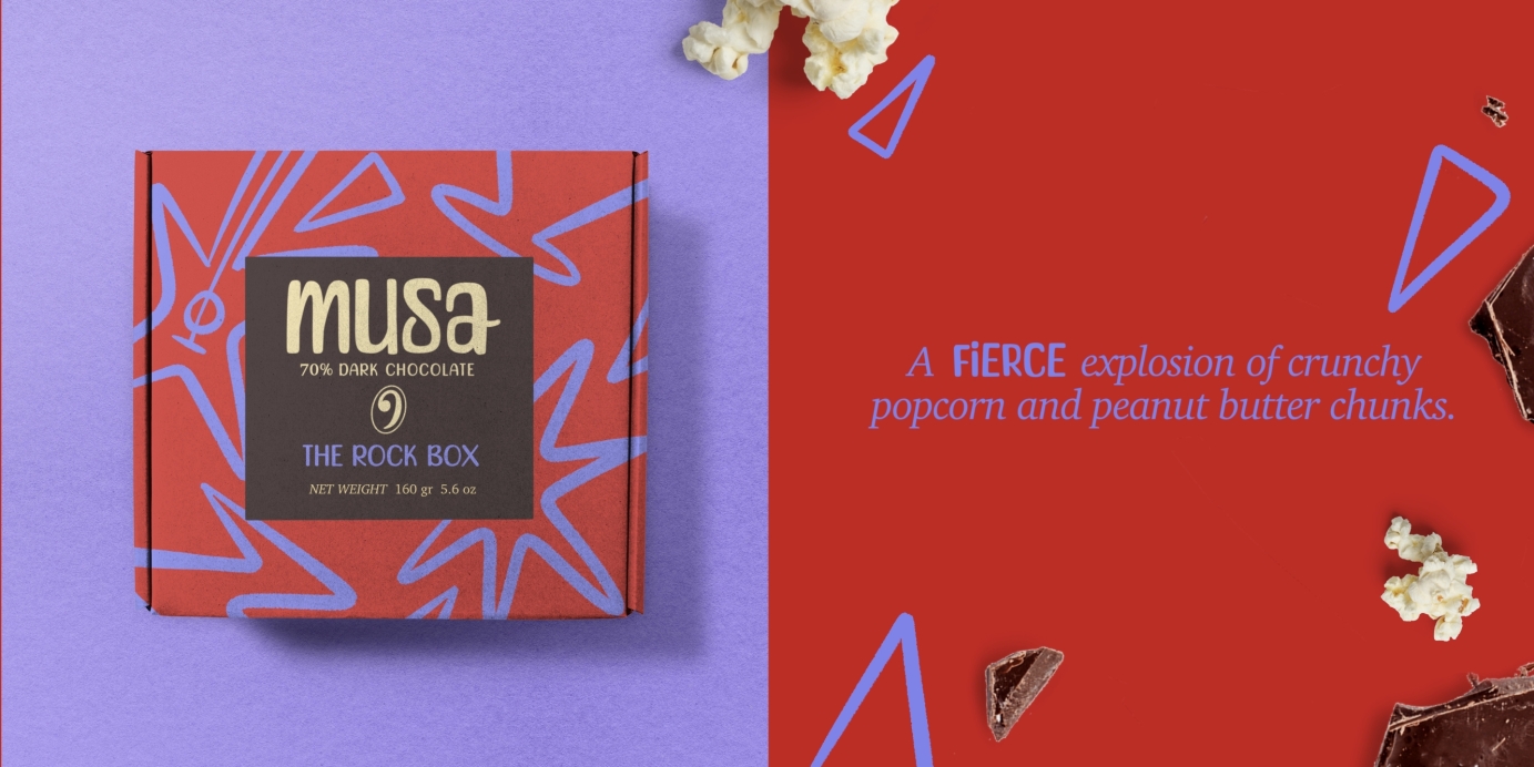 Each box design embodies the respectable genre - The Rock Box is vibrant and loud, whereas the Classic Box maintains its form and steady pattern. The logo and typography is free-flowing and mimics the imagery of musical notes, whilst suggesting luxury that comes with dark chocolate.