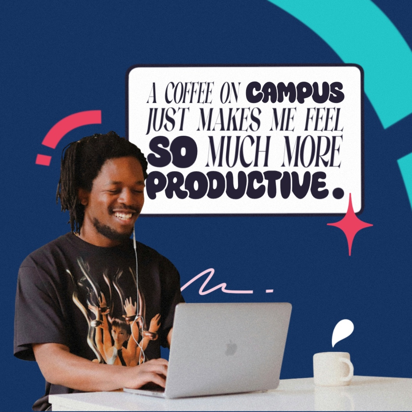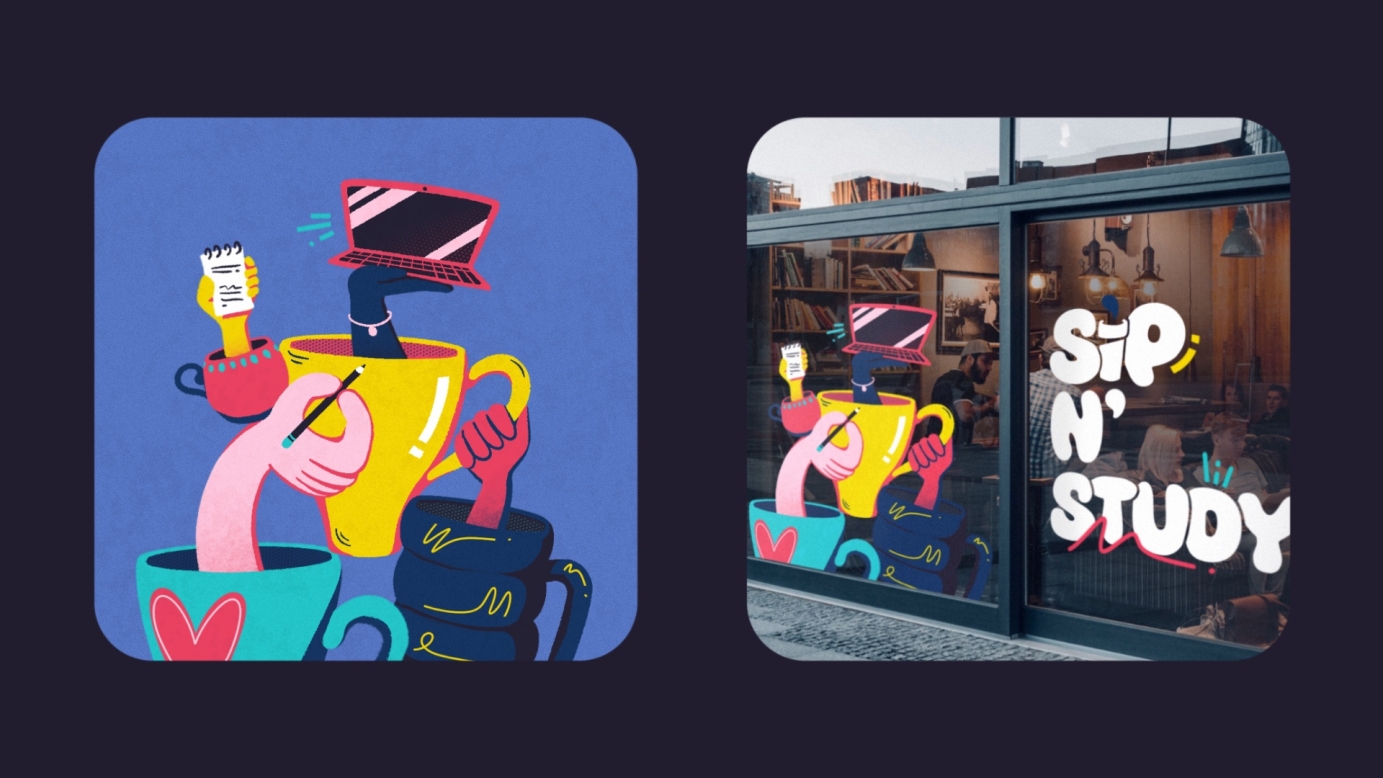 Visually, the Brand Identity heavily follows current design trends to grab the attention of forward-thinking students. This includes branded illustration, merging fonts, bold colour palettes and curve smoothing. With engaging Instagram Stories and interactive posts, this Cafe is set for great interaction from career-driven young people.