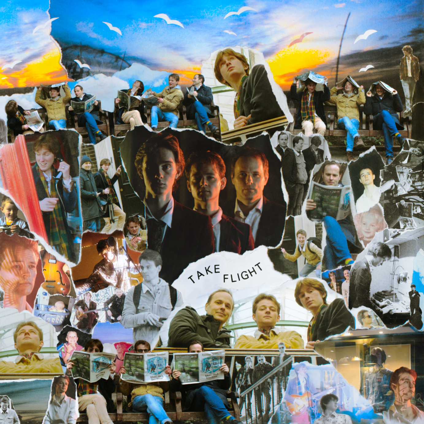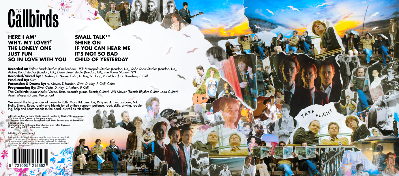 I set about creating a collage that used the wealth of images I had amassed of the group over 2 years as well as photographs from our own personal archives. this included photos of the band from childhood to now. You can see several stories unfold in shots across the artwork: the band members getting more and more inundated with birds across the top of the image, Isaac and Will speaking to eachother on the phone in the centre (these two being a less than subtle reference to the name of the band) as well as the actual history of the band from start to finish from their earliest performances and photos to the album recording sessions and meetings with their new record label. There are also references to the band's flowery shirts that they wore during their first UK tour.