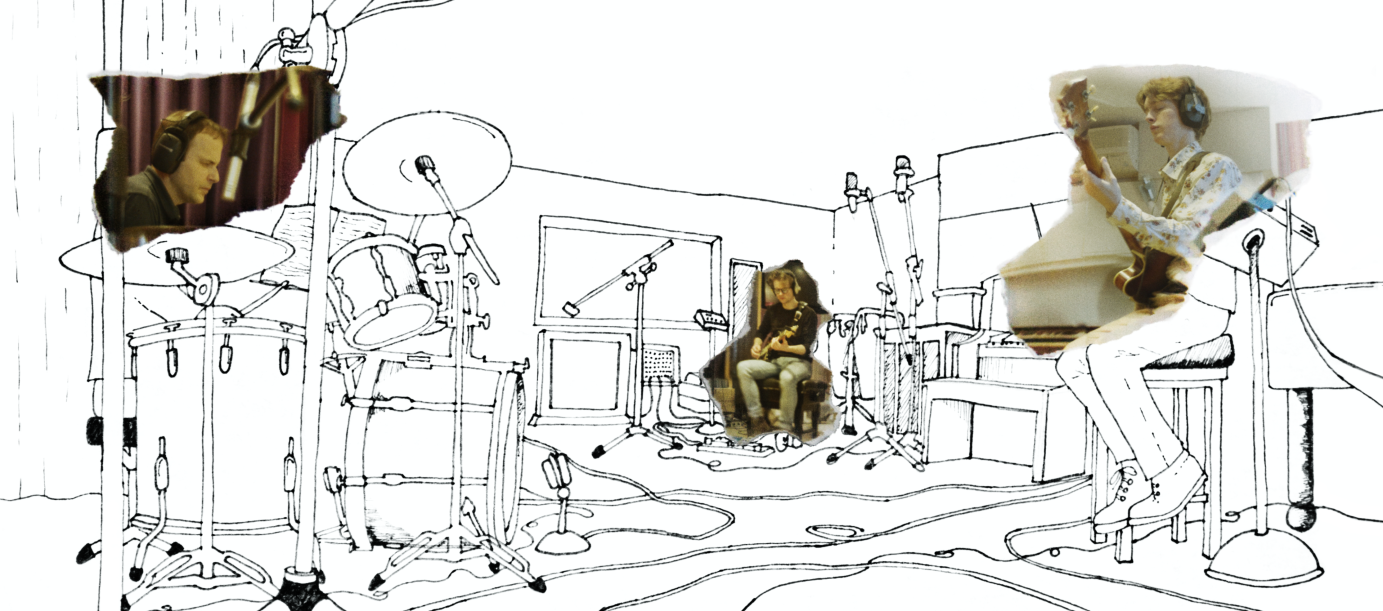 I then created the inner gatefold artwork. I wanted to keep with the "scrapbook" theme but also introduce something new. The studio that the bulk of the album was recorded in was rather small compared to others in the UK, so I created a panoramic "doodle" that I wanted to convey what it was like to record the album. There was no actual panoramic photograph of the studio to work from, however there was lots of video. I stitched together several frames of video together to create a partial panorama, then used my imagination and memory to fill in the missing pieces.