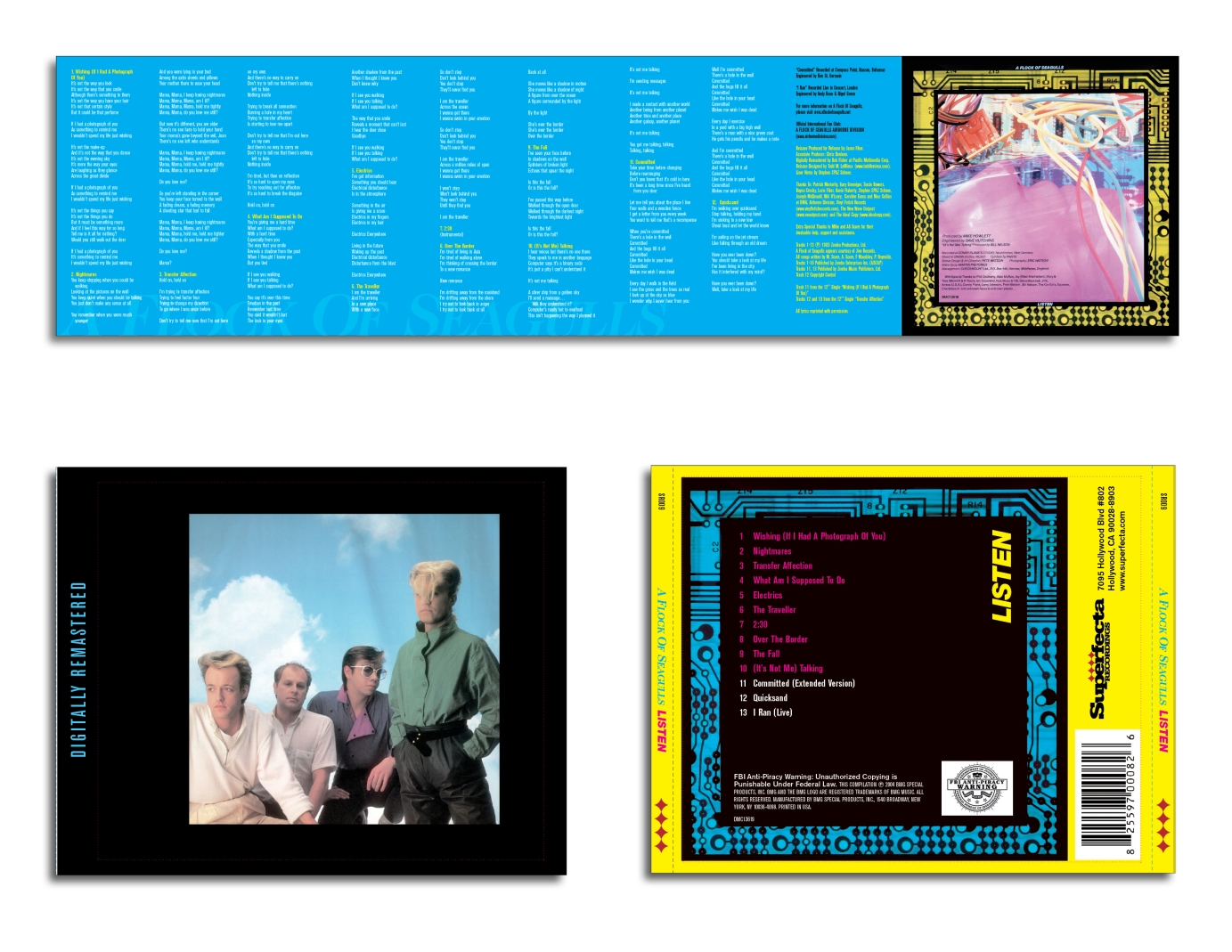 Package redesign for A Flock of Seagulls "Listen" album; all new design with the exception of the cover panel, which I had to recreate from the original to maintain recognition.