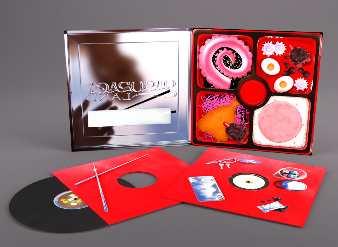 The record itself reflects the experience of opening a gas station "bento" box. The backside of the record has the tracklisting smartly replacing the purchases on a receipt, while the inner sleeves and vinyl stickers allow you to rotate the record and decide how you want your "table" to look.