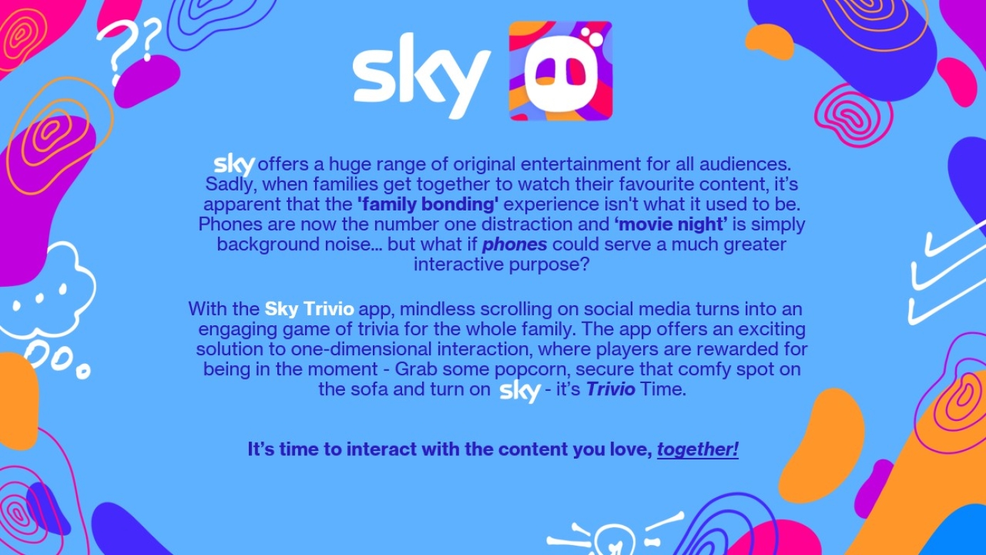 Awarded the Graphite Pencil, submitted as part of the D&AD 2023 New Blood Awards. The Sky Trivio App concept showcases how phones can become an interactive tool, instead of a distraction, when watching Sky content. This interactive Trivia app creates an engaging watching experience for the whole family. The full submission and process is shown below.