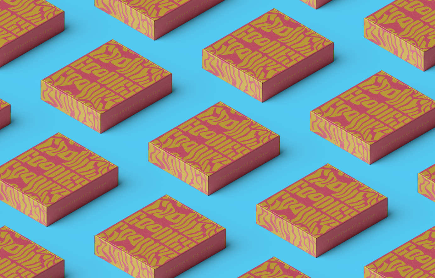 I chose a flap-box packaging as it is a well-sealed and attractive form of packaging that is reminiscent of cookie packaging. The perfume bottle would be securely nestled inside. This can be created using materials like cardboard, paper and fabric. The stylised logo mark appears to drip and spill over the box the way glazing would drip over baked goods. The scent is printed on the side of the box and a corresponding illustration pattern appears in the background.