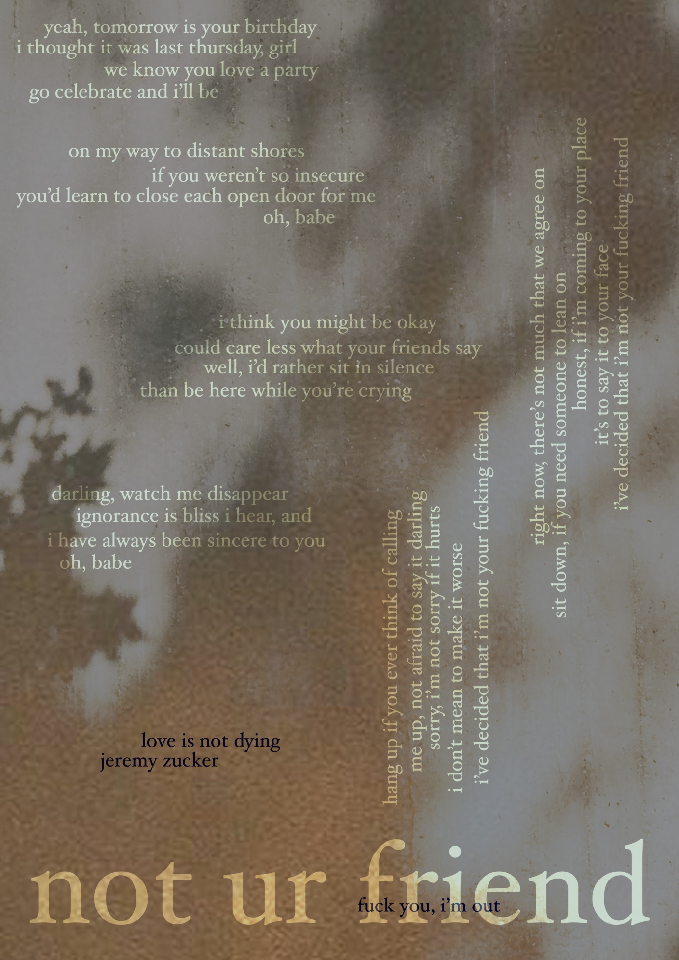 A fan project focusing on expanding the overall identity of Zucker’s album. By referencing existing promotional content and music videos released by Zucker and his team, I created individual lyric posters for all 13 songs within the album.