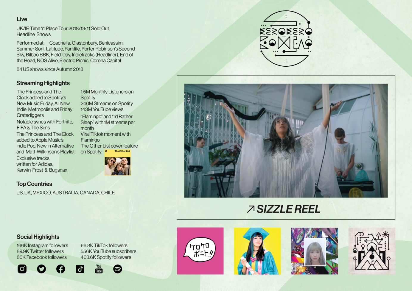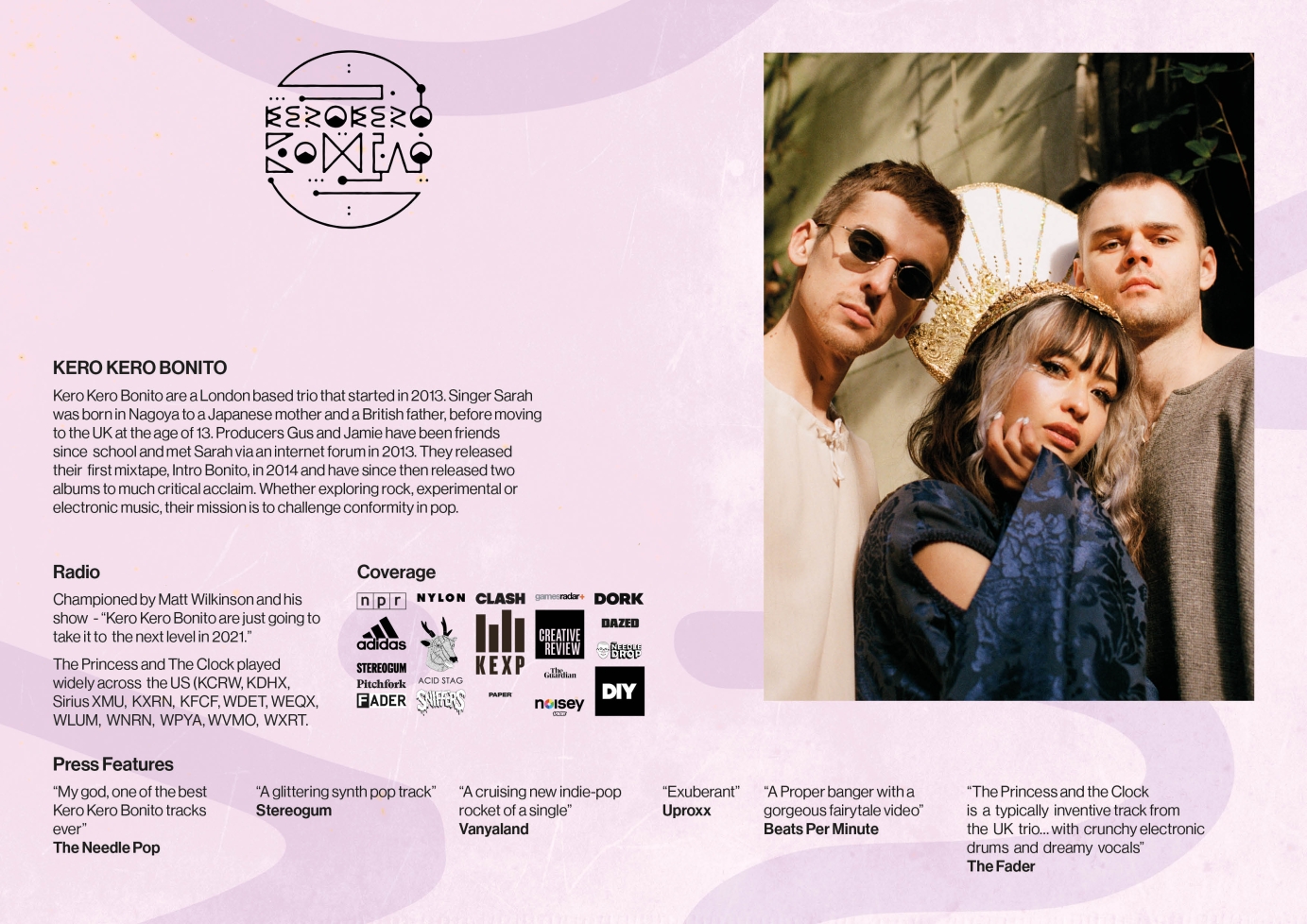 Artist one-sheet for Kero Kero Bonito. Updated one-sheet for Kero Kero Bonito; all layout and design by me.