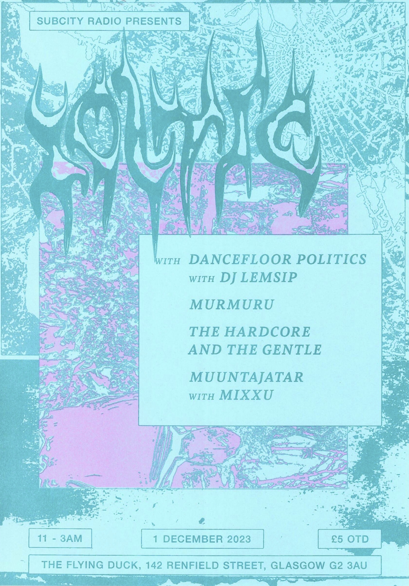 Poster for Subcity Radio's event Iolyte, held at the Flying Duck.