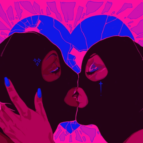 Influenced by horror, neo-noir, glamour and lowbrow aesthetics, her work often explores both intersection and contradiction: the intersection of warring traumas, of race, sexuality and identity, and contradictions in message, symbolism and subject matter: between the feminine and the macabre, the vibrant and the melancholy, the traditional and the grotesque. Her painting style seeks to balance figurative, pop and surrealist elements in a way that creates a sense of unreality that, depending on content and context, could present as dreamlike or nightmarish.